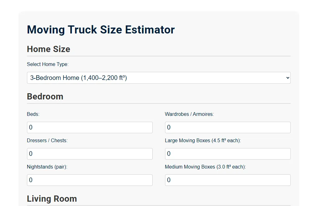 Our Moving Truck Size Estimator isn’t just a generic calculator. It’s built to mimic the way people actually prepare for a move. By organizing the tool by room type, it guides you through your home, helping you remember and account for everything you own.