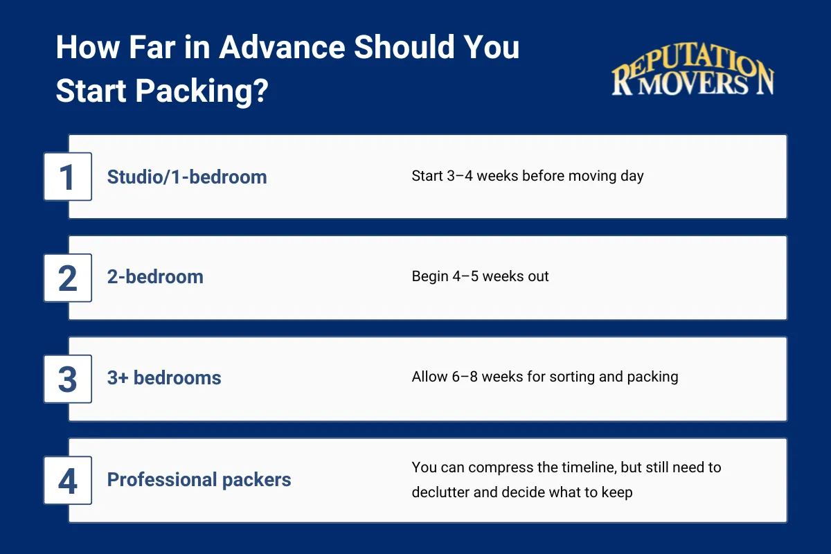 The right time to start packing depends on your home’s size, the volume of your belongings, and the complexity of your move. For a studio or one-bedroom apartment, three to four weeks is usually sufficient if you pack a little each day and stay organized. This allows you to sort through your things, donate or discard what you no longer need, and pack at a comfortable pace without disrupting your daily routine.